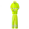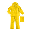 Completo giacca e pantalone con chiusura centrale con cerniera, maniche raglan, elastico ai polsi, 2 tasche anteriori, cappuccio inserito nel collo, cordino stringivita, fori di aerazione sotto le ascelle, elastico girovita, apertura anteriore, fondo gamba con bottoni automatici, 2 tasche laterali passamano, inseriti in busta di nylon con cerniera.