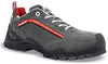 Calzatura bassa in pelle scamosciata forata colore grigio, cuciture di colore arancio, fodera interna di colore arancio, linguetta imbottita, puntale in composito, lamina in acciaio, soletta estraibile traspirante e antistatica, suola in poliuretano bidensità.
